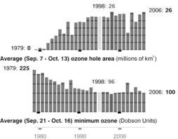 Летом и весной концентрация озона повышается. Над полярными областями она всегда выше, чем над экваториальными. Кроме того, она меняется по 11-летнему циклу, совпадающему с циклом солнечной активности. Все это было уже хорошо известно, когда в 1980-х гг. наблюдения показали, что над Антарктикой год от года происходит медленное, но устойчивое снижение концентрации стратосферного озона. Это явление получило название «озоновая дыра» (хотя никакой дырки в собственном значении этого слова, конечно, не было).