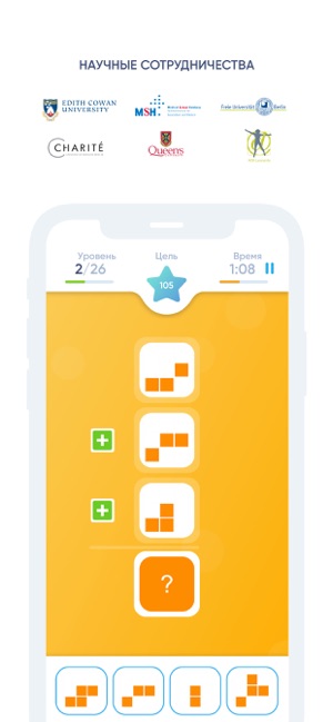 Приложение предлагает четыре игры для прокачки памяти, внимания, математических навыков (этот раздел по непонятным причинам называется «гибкость») и скорости. По концепции это несколько ужатая версия Peak, зато полностью русифицированная.