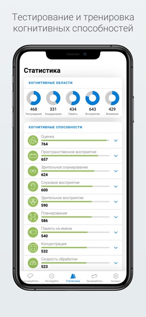 Сервис оценивает 23 когнитивные способности пользователя, причём речь идёт не только о склонности к вычислениям или умении запоминать. Система проверяет на бессонницу, депрессию, СДВГ и так далее.