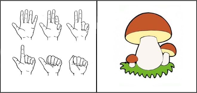 Считаем пальчики: раз, два, три и т.д. Загибаем каждый палец поочередно, проговаривая стишок о том, как пальчики искали грибочки, кулачок не разжимаем.