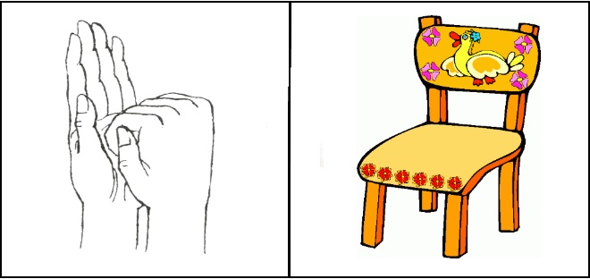 Изображаем кулачком и ладошкой стол, меняйте положение рук поочередно. Потом стул: поднесите к кулачку раскрытую ладонь, приставьте ее к одной из сторон кулака.