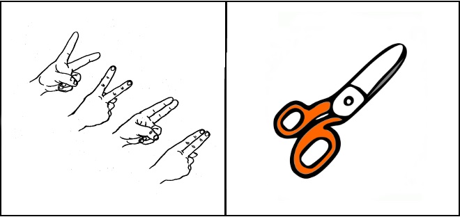 Ребенок изображает пальцами ножницы, делает характерные движения, будто режет ткань.