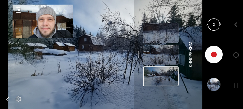 В приложении «Камера» есть «кинорежим» который позволяет записывать видео сразу на несколько камер. Можно одновременно записывать видео на фронтальную камеру и на основную камеру.